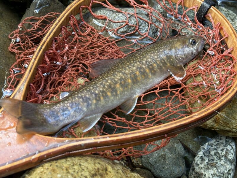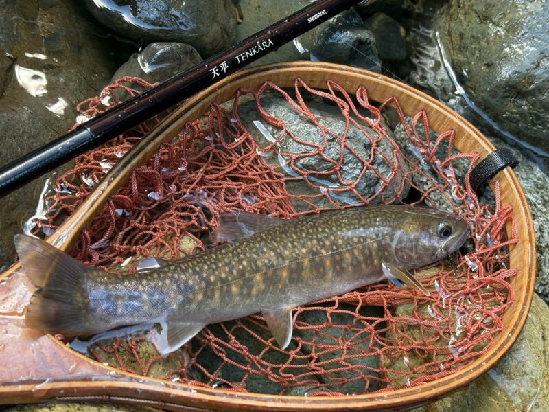 翌日、取材の場所としては今回は諦めです。なので朝からイワナの顔を見ようと沢へ入りました。しかし反応はイマイチ、ひたすら毛鉤を打ち込みながら1時間は遡行したでしょうか、ようやくまともなサイズのイワナが掛かりホッとします。山形県まできてイワナやヤマメの顔も見ずに帰るのはあまりにさびしすぎますからね。今回入った沢は以前にも入っているのですが年々魚影が減っているように思います。数年はそっとしておこうと思いました。