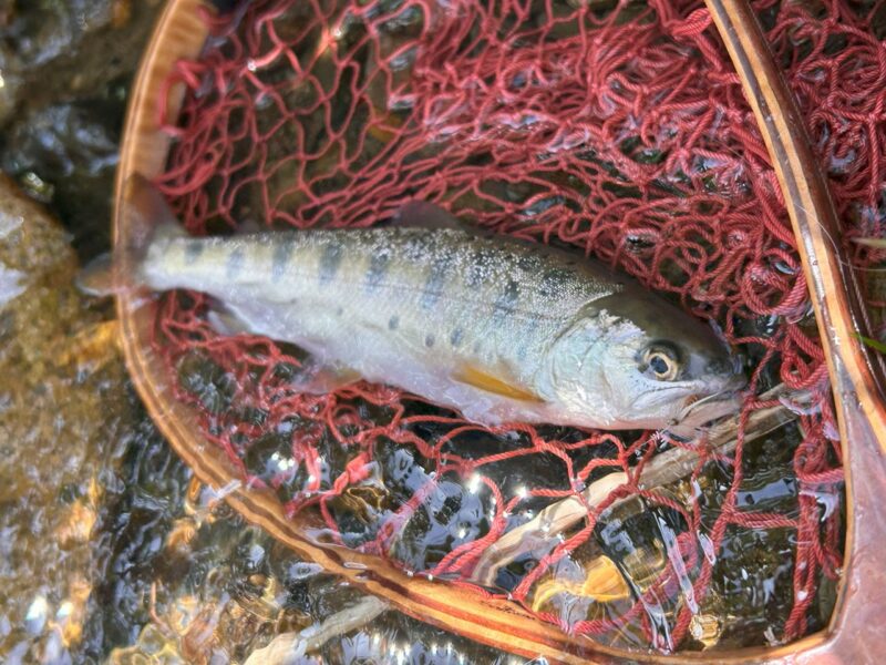 表層ではあたりがなく、タングステンの粘土おもりで少し沈めましたがそれでも反応なし。そこでなるべく岸際狙いに切り替え、誘いを入れながら探ります。するとようやくイワナが掛かりました。そこにへばりついている魚を狙おうとしてもうまくいかない時は増水で流れの弱い岸際へ移動している魚を狙ったほうが良いパターンでした。