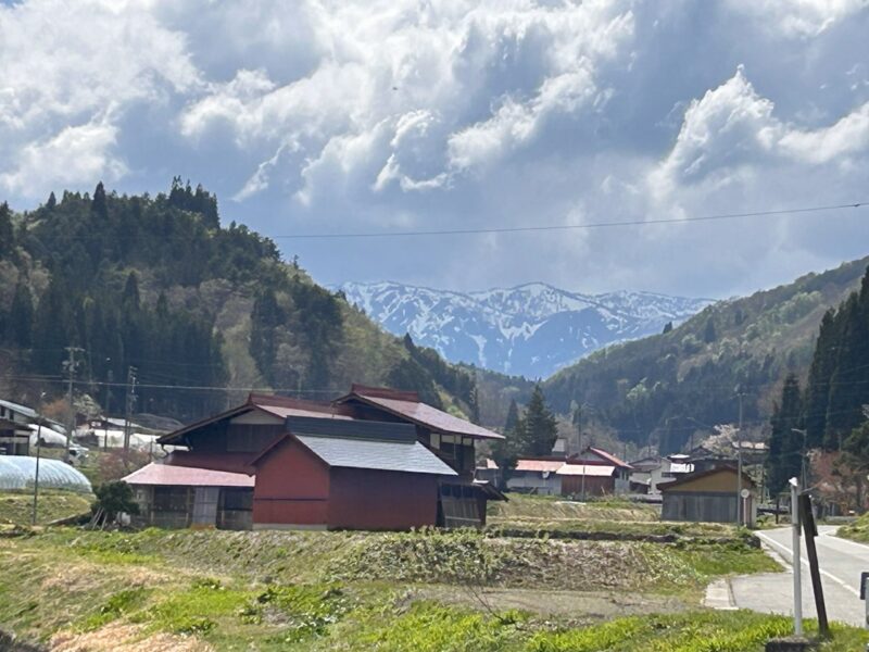 遠くに残雪がついた山並み、田んぼに裏山、the日本の里山な風景が私は大好きです。こんな風景の中テンカラ竿を振る時間は至福の時ですね。