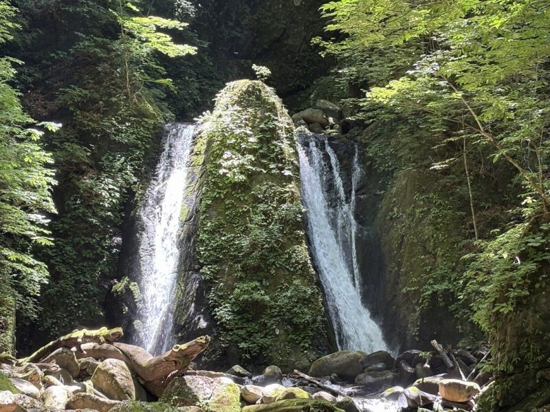 前方に立派な滝が出てきました。「雄滝」と言うそうです。林道からは遊歩道が滝まで続き、時折見物客が見にきていました。その横でテンカラを振り続けます。釣りをじっくり見られるとちょっと恥ずかしいものです。