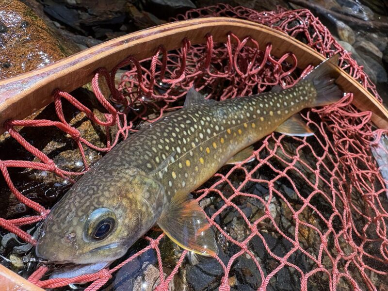 釣りを始めて小さなイワナを数匹釣らせてもらいました。そこで高橋さんの釣りが見たくて竿を出してもらいます。やはり上手な人の釣りは参考になります。そのアプローチからキャスト、取り込みまで一連の流れが見ていて気持ちいいものです。この日はエルクヘアカディスを使っていましたが、ものすごいキワキワのピンスポットにもきちんと入れていきます。さらに、さすがプロタイヤーの高橋さん、そのエルクヘアカディスの浮力、見易さが抜群なんです。やはりエルクの量やバランス、マテリアルの質などいろいろな要素が詰まっていてこの見易さ浮力なんでしょうね!