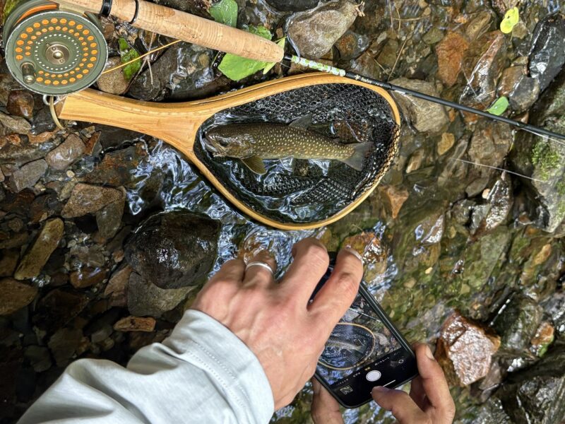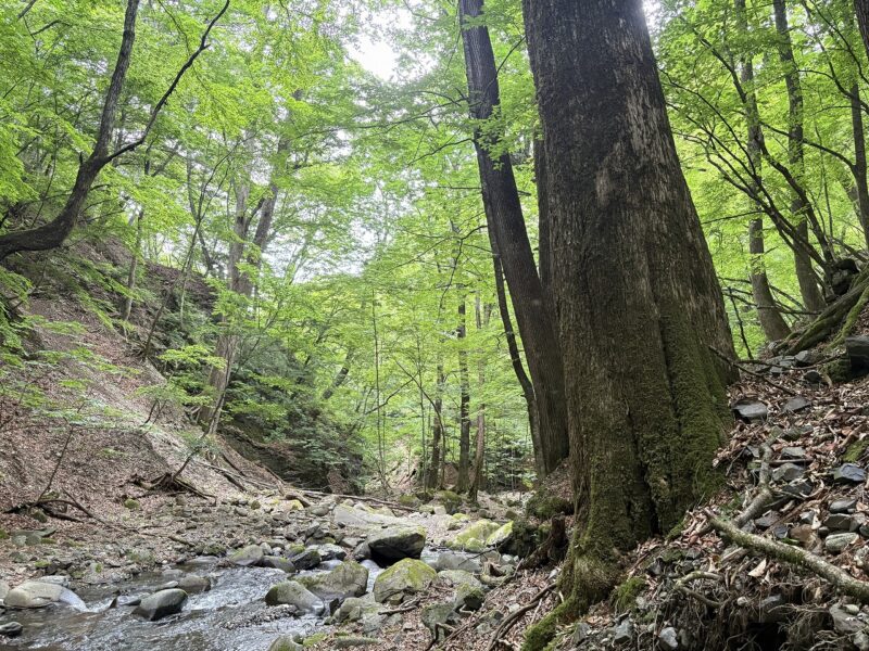 高橋さんに案内してもらい渓に降り立つとまずびっくりしたのがその美しさです。都内近郊の渓流では植林された山の中を流れる場所が多い。しかし、小菅川の源流域はこんな巨木まで残っているのかと驚きました。やはり自然林の残る渓相は美しい。魚が釣れればうれしいですが、やはりこんな雰囲気の中で釣れたほうがよりうれしいですよね。