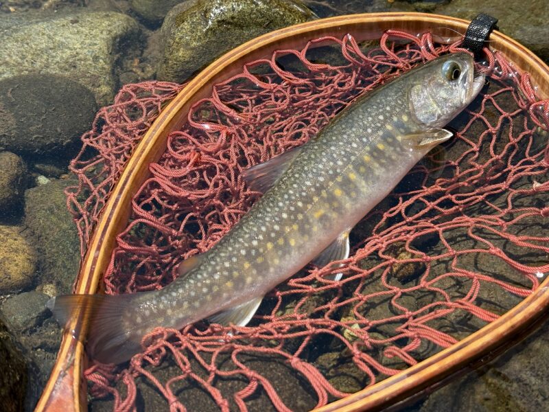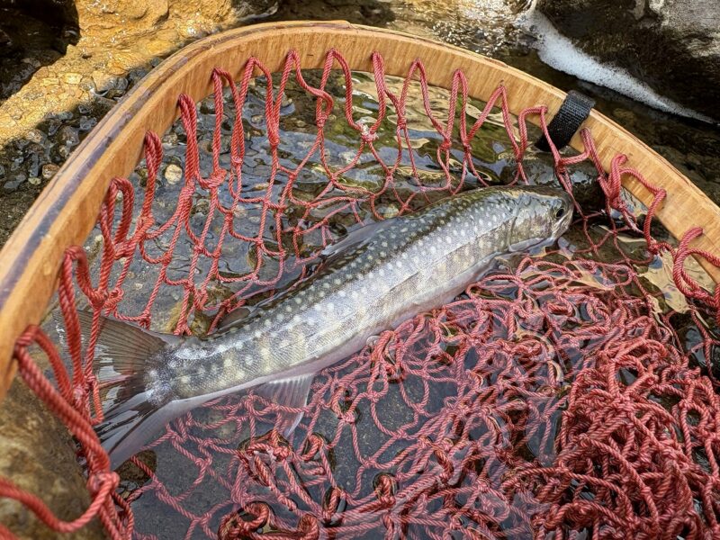 気を取り直して毛鉤を茶羊胴白柴花笠#12に戻し流れの中を釣ります。毛鉤も良く見えて魚の出方も楽しいドラッグドリフトで出てくれました。立ち位置を上流側にとり、キャストした毛鉤にテンションを掛け実際の流れより少し遅く流れるようにします。すこしブレーキをかけて流してあげる感じです。当然毛鉤は水面近くを流れ、流れに抵抗ができ毛鉤の後ろには引き波のようなものができます。自分の毛鉤の位置がはっきりとわかる状態で流します。このイワナは素直な感じで毛鉤を咥えてくれました。