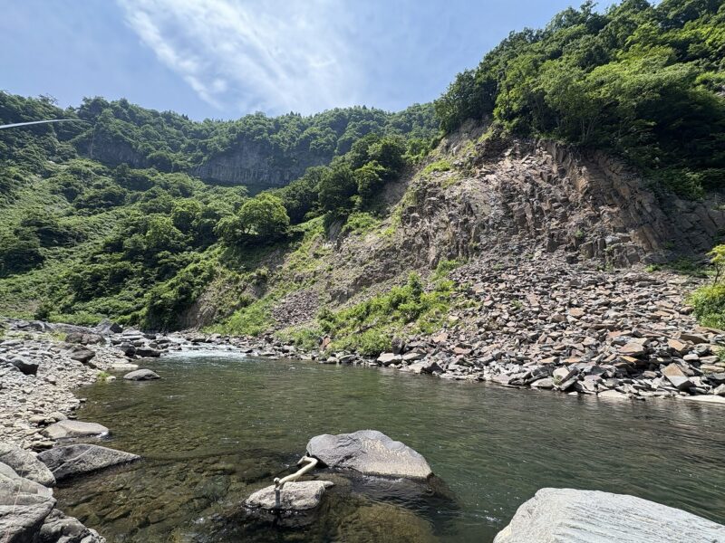 3尾目のイワナを釣って景色を見るとこの絶景です。後ろには柱状節理の岩壁が立ちそびえています!結構近くでみると圧倒される感じの岩壁です。解放感たっぷりの釣り場です。