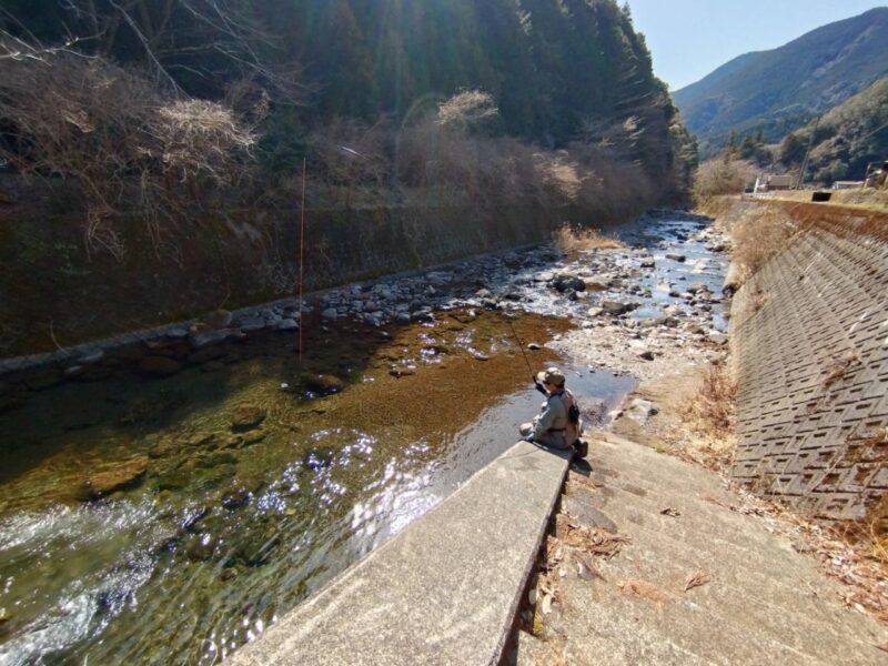 次に移動した場所も堰堤の下。やはり放流ポイントにはアマゴが入っています。堰堤からの流れ出しと反転流で2尾を掛け、次のポイントを探して移動します。川を釣りあがるには渇水でちゃらちゃらの流れ、とても釣れる気がしないので放流ポイントの深みをランガンで攻めます。