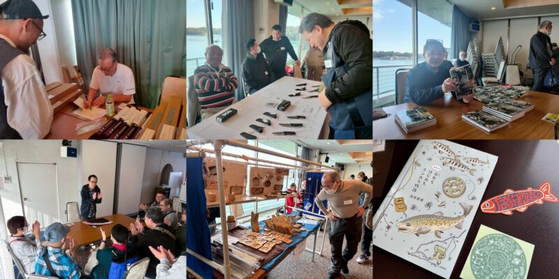 大王様のエース釣具店のシマノテンカラ竿の代理販売、いつもこんなにどうやって安くなるのって?不思議なくらいのお値段!天平テンカラ、BGテンカラ、そして新製品の渓流テンカラ!お目当ての竿をこの場を待って購入される方が多いのもキックオフミーティングの魅力!玉ウキテンカラの原沢さんの手品見たかったなぁ、私は初めての著書「テンカラ完全入門」を販売していたので見れませんでした。池田亜季さんの「Akiのゼロから始めたテンカラ物語」販売もイラストが可愛くステッカーも合わせて即バイトしてしまった。キクさんのナイフや春日さんお木彫りも相変わらずの人気ブースです!
